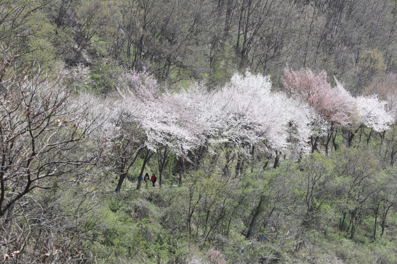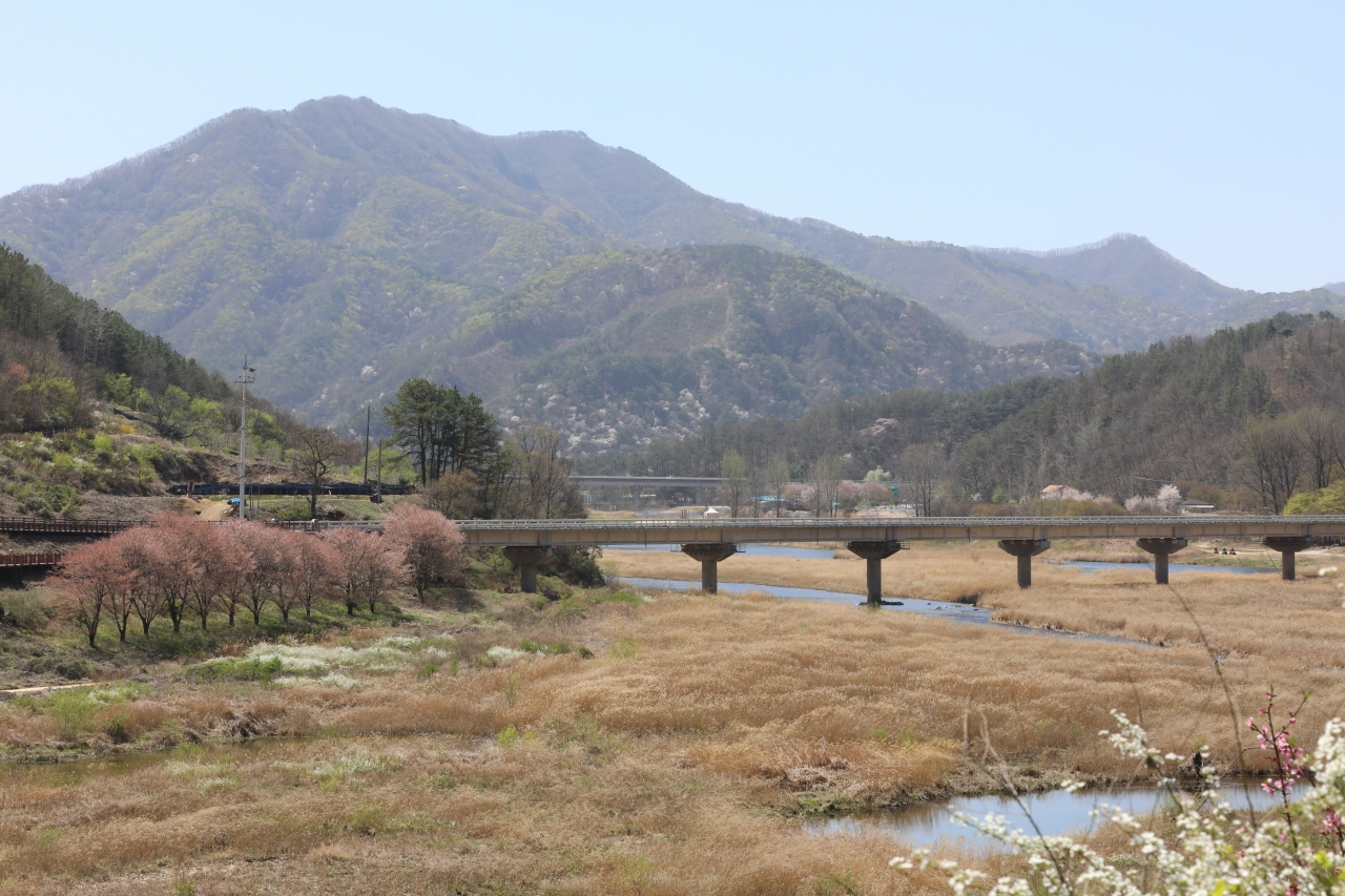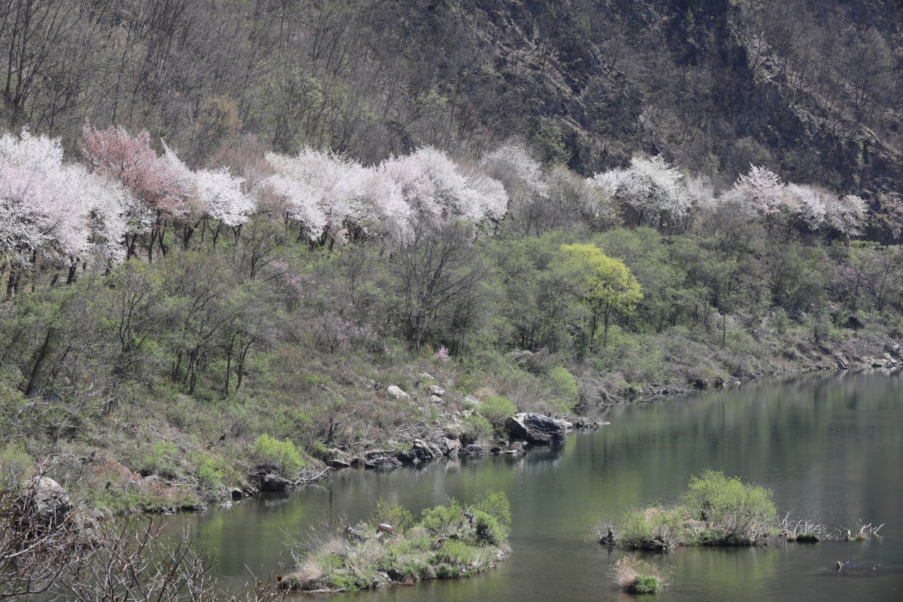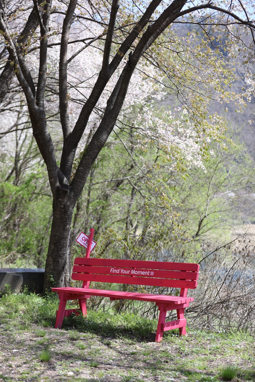 빛이 스며든 옛길은 미지의 세계로 향하는 통로다. 자동차가 다니던 옛길은 두 사람이 손잡기 걷기에 딱 좋을 만큼의 넓이다. 벚나무 가로수가 늘어선 옛길 입구에서 5분쯤 걸어 들어가면 탁 트인 시야와 함께 금강의 물줄기가 한눈에 들어온다. 벚꽃과 산복숭아나무꽃, 조팝나무꽃이 한데 어우러져 금강 최고의 절경을 만들어낸다.