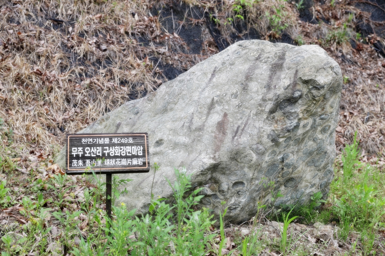 첫 번째 보물은 주민들이 호랑이 바위라 부르는 구상화강편마암이다. 구상화강편마암 보호지역은 마을을 지나 골짜기 끝에 있다. 변성암 속에 공처럼 둥근 구상암이 들어있는 형태의 암석으로 그 희귀성을 인정받아 천연기념물로 지정·보호되고 있다.