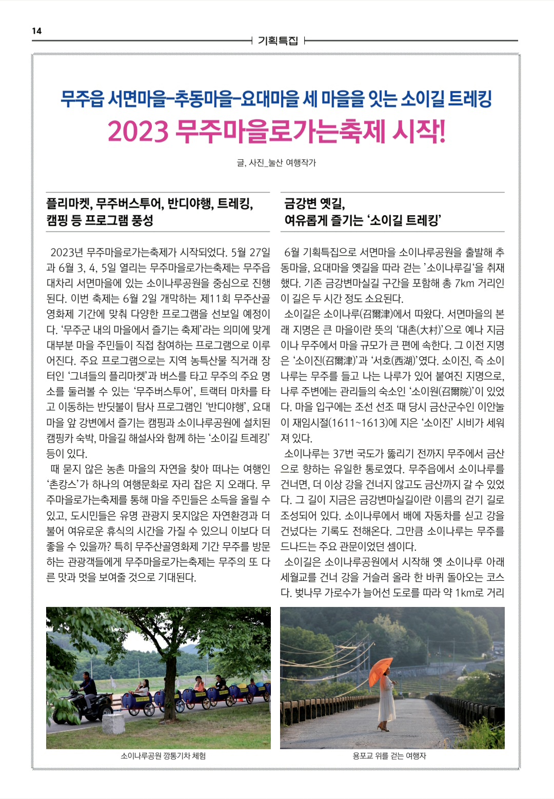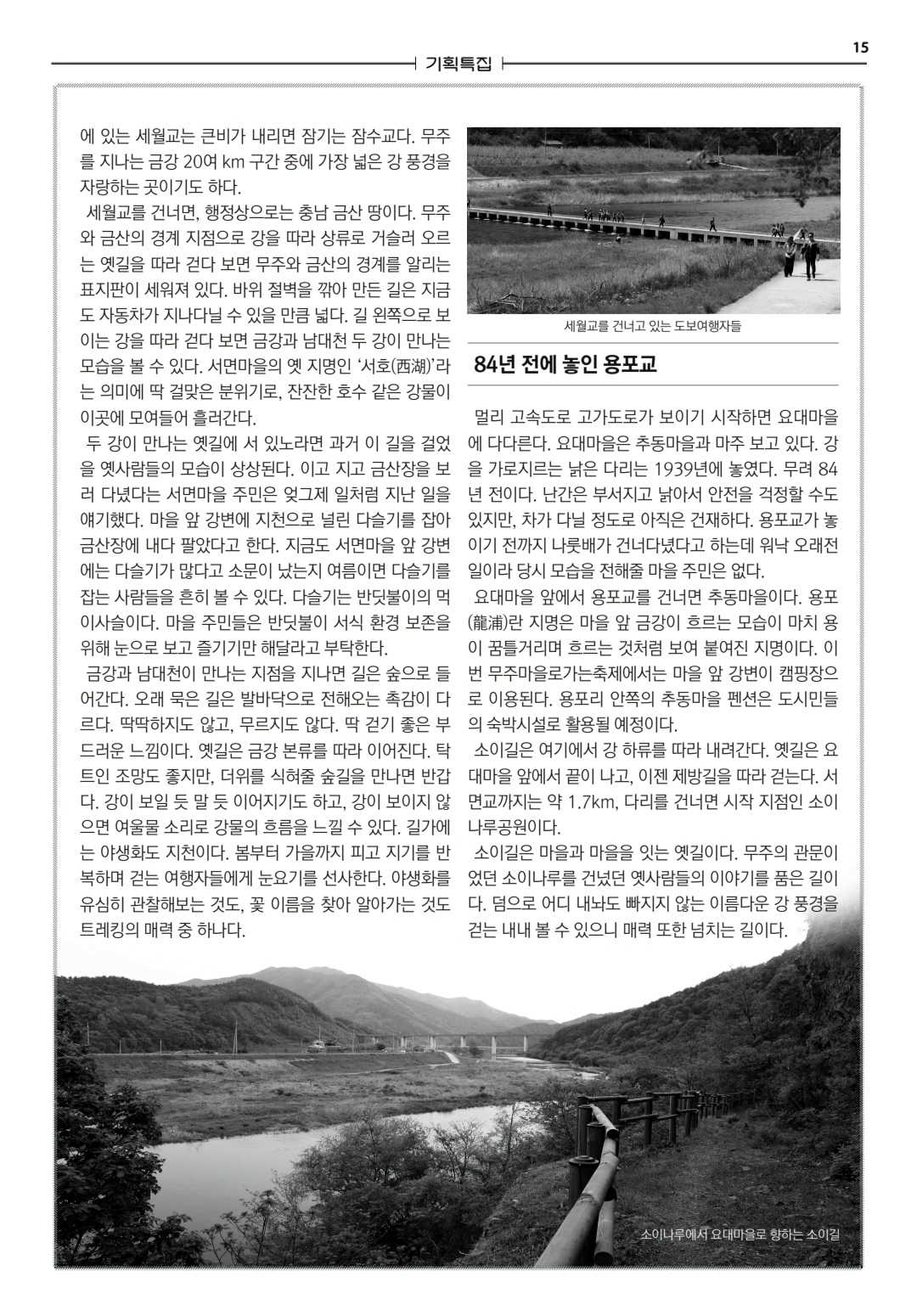 6월 기획특집으로 서면마을 소이나루공원을 출발해 용포리, 요대마을 옛길을 따라 걷는 ’소이나루길‘을 취재했다. 기존 금강변마실길 구간을 포함해 총 7km 거리인 이 길은 두 시간 정도 소요된다.